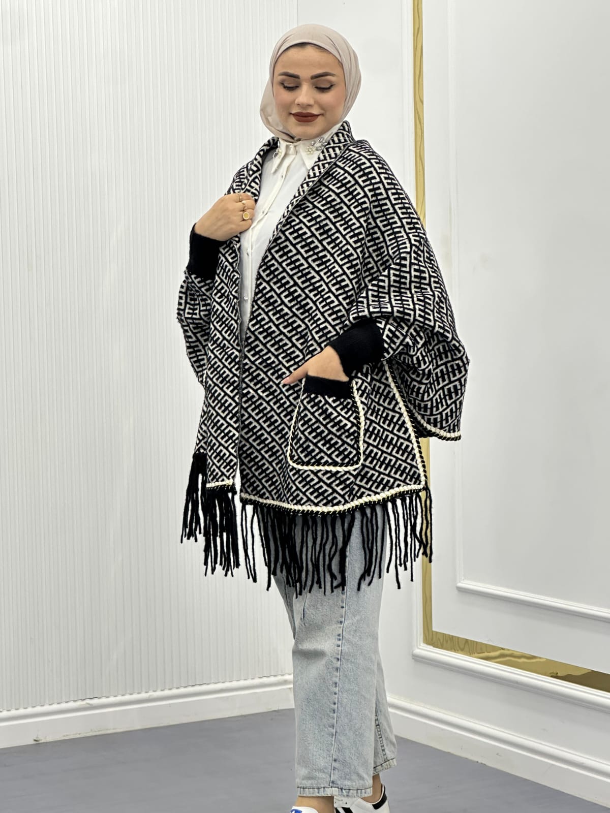 شالات كتف شتوية مع أكمام اسود ابيض